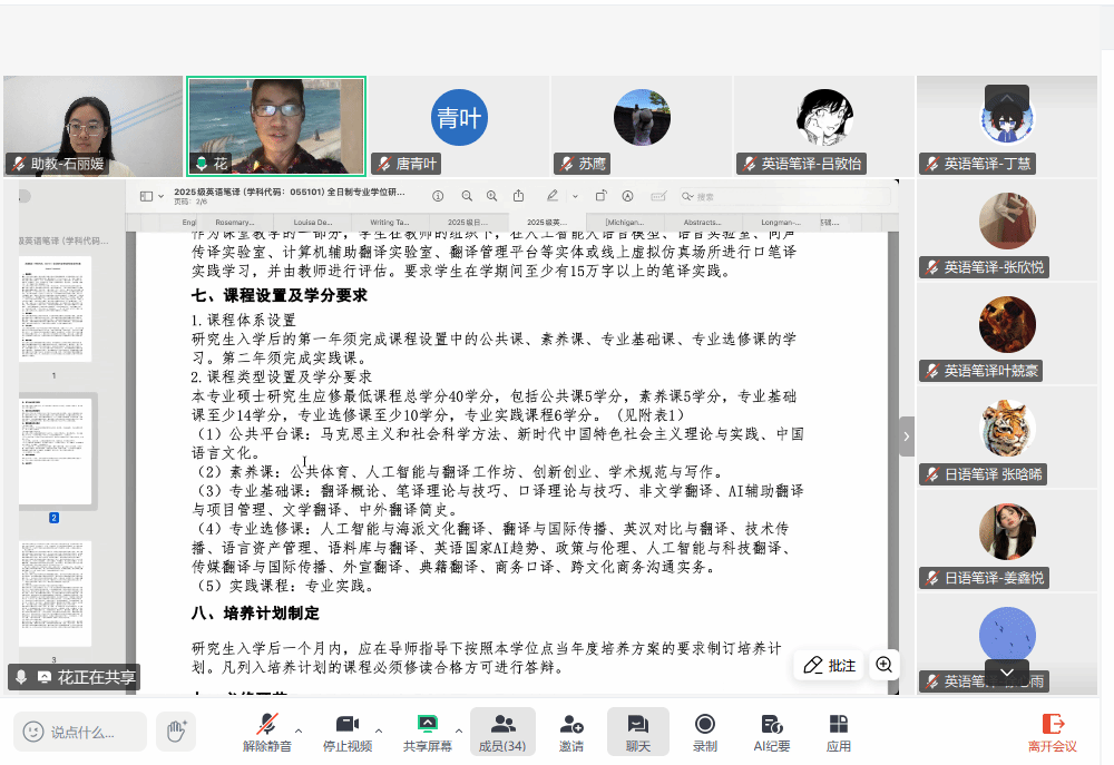 2025年9月15日晚,600全讯白菜网2025级非全日制研究生们通过线上平台齐聚一堂,召开了一场别开生面的班会。此次班会由MTI教育中心副主任花亮主持,600全讯白菜网副院长唐青叶、日语系副系主任苏鹰出席会议并致辞,与同学们进行了亲切互动。