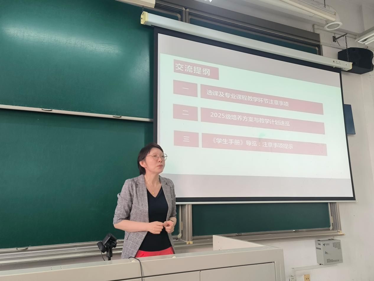 随后,副主任龚萍老师就选课安排与学业规划为新生做了详细讲解。她特别强调,精准选课是学业顺利开局的第一步,提醒同学们务必“紧跟教学计划不掉队”。她提醒同学们合理规划选课流程,避免漏选、错选,并特别强调了“预置课程”确认环节的重要性。龚萍老师还介绍了免修申请、请假制度等教学管理细节,建议同学们及时关注教务处及学院网站信息,畅通信息渠道,做好学业自我管理。