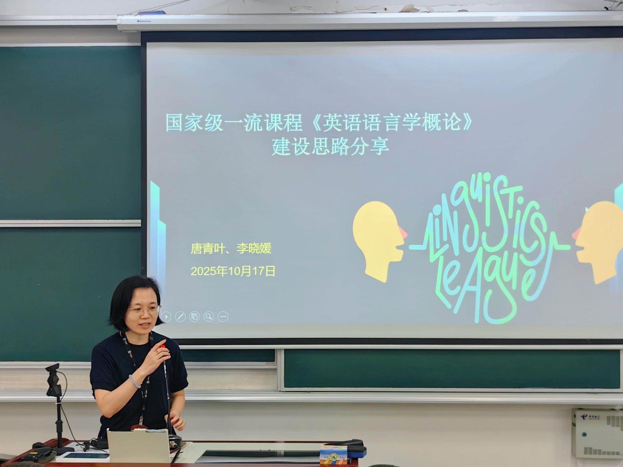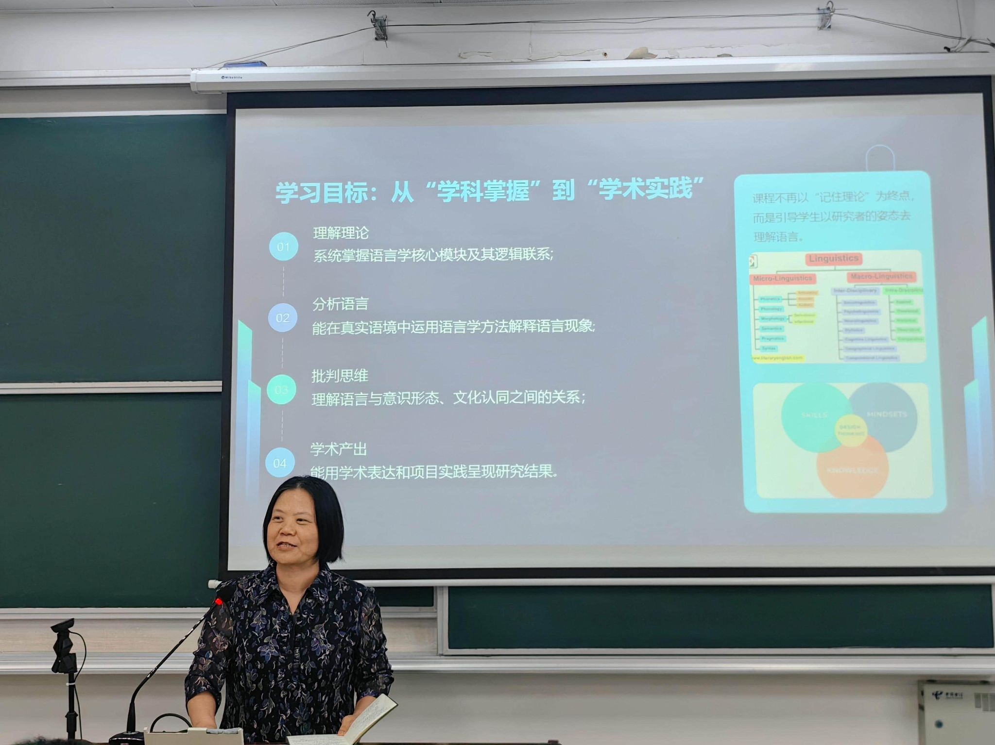 唐青叶教授、李晓媛副教授分享了国家级一流课程《英语语言学概论》的建设情况。李晓媛老师介绍了课程的建设历程、特点,并基于对特点的思考,汇报了在教育理念和学习目标方面做出的尝试。唐青叶教授对在课程设计和学习共同体方面的尝试进行了详细汇报。她指出,课程建设是一个通过将教师的科研项目与教学实践进行自然、良性的互动与融合,从而实现水到渠成“创一流”的过程。在此过程中,培养了众多进入国内外顶尖学府深造的优秀学生,产出了系列创新创业项目。唐青叶教授表示,未来该课程将继续致力于资源建设、模式创新与团队发展,真正促进学生成长成才。
