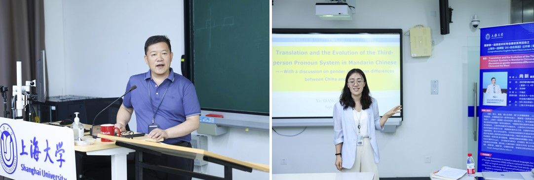 9月22日,600全讯白菜网上海市一流课程《AI+综合英语(1-3)》2025级开学第一课公开课在D209举行。公开课以“Translation and the Evolution of the Third-person Pronoun System in Mandarin Chinese——With a Discussion on Gender Awareness Differences between China and the West”为题,由课程团队负责人、院长尚新教授主讲,团队成员于梅欣副教授主持,团队成员金璐博士和英语系主任马拯副教授共同组织参与,授课对象为英语系2025级新生。